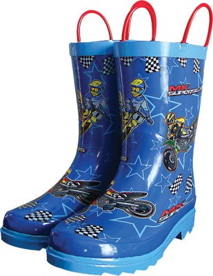 These boots are made for walking and splashing in mud and puddles. They are also great for wearing to the track. The MX Superstars youth rain boots are made of waterproof rubber and include fun, motocross inspired prints. Firefighter-boot inspired grab handles help when trying to pull them on while the treaded sole provides the extra traction on rainy days.